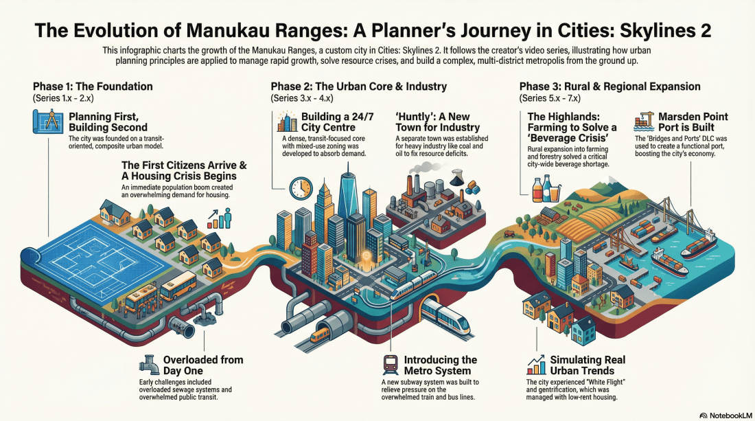 The Evolution of Manukau Ranges: A Planners Journey in Cities Skylines 2 1.0 Introduction and Review Mandate The development of Manukau Ranges presents a compelling case study in the disciplined application of transit-oriented development principles, from initial foundation to a mature, polycentric city of 200,000 residents. This strategic review provides a comprehensive analysis of the … Continue reading Strategic Review: Urban Planning and Development of Manukau Ranges #CitiesSkylines2