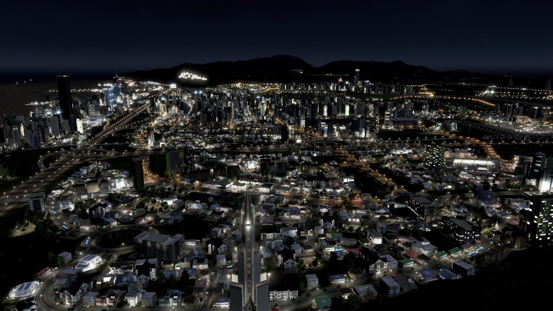 San Solaria at night Night shots of your Cities Skylines cities I find are a work of art and beauty. Just something about night time over a humming city that gives emphasis that your City is alive. San Solaria is a 24 hour city with activity always happening whether it be the industrial complexes, … Continue reading #CitiesSkylines Night Shots an Art of Beauty